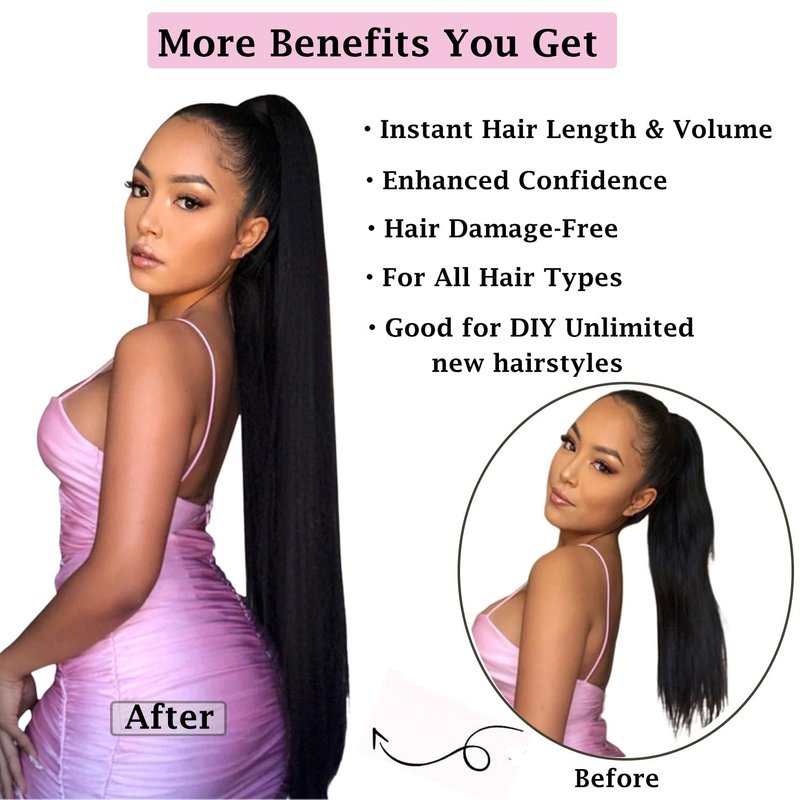 - FULL VOLUME BEAUTY. 24 inch yaki straight hair extensions are full volume. They won't run, fade, or harm natural hair. Easier to use than hair wrap or drawstring ponytail. Enjoy silky soft strands more durable than human hair ponytail extension.