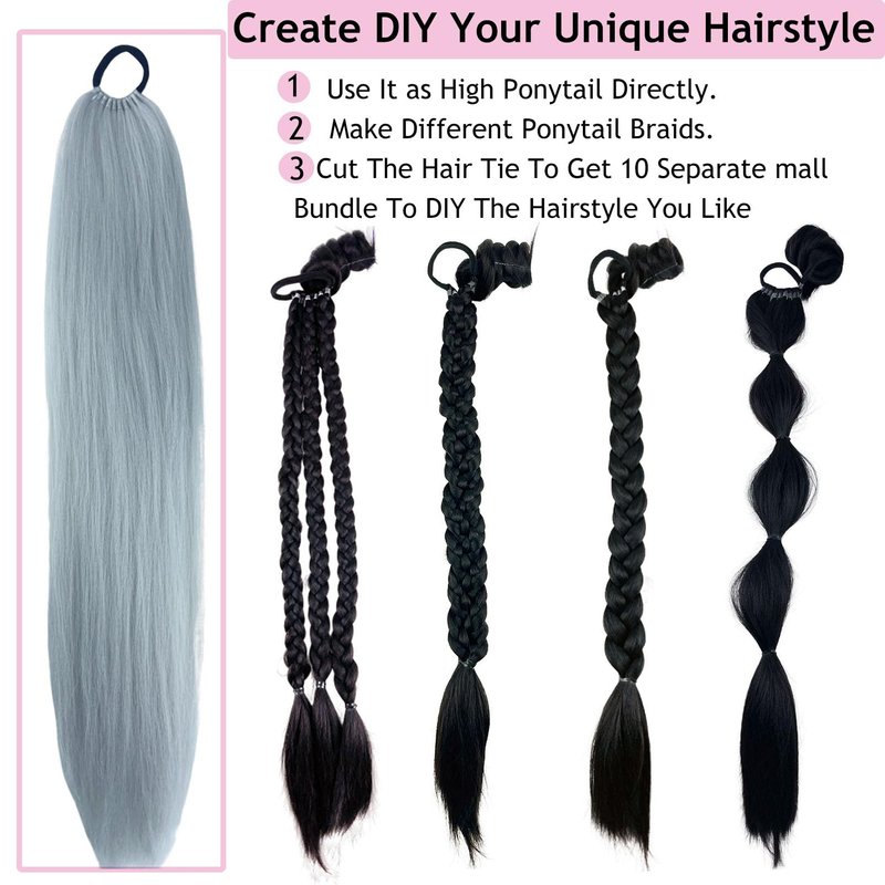 Hair Features: Same As The Picture, It Was Tied On The Hair Band, Yaki Straight Ponytail, Also can be DIY Braided.1. Use It As High Ponytail Directly. 2. Make Different Ponytail Braids. 3. Cut The Hair Tie To Get 9 Separate Small Bundle To DIY The Hairstyle You Like