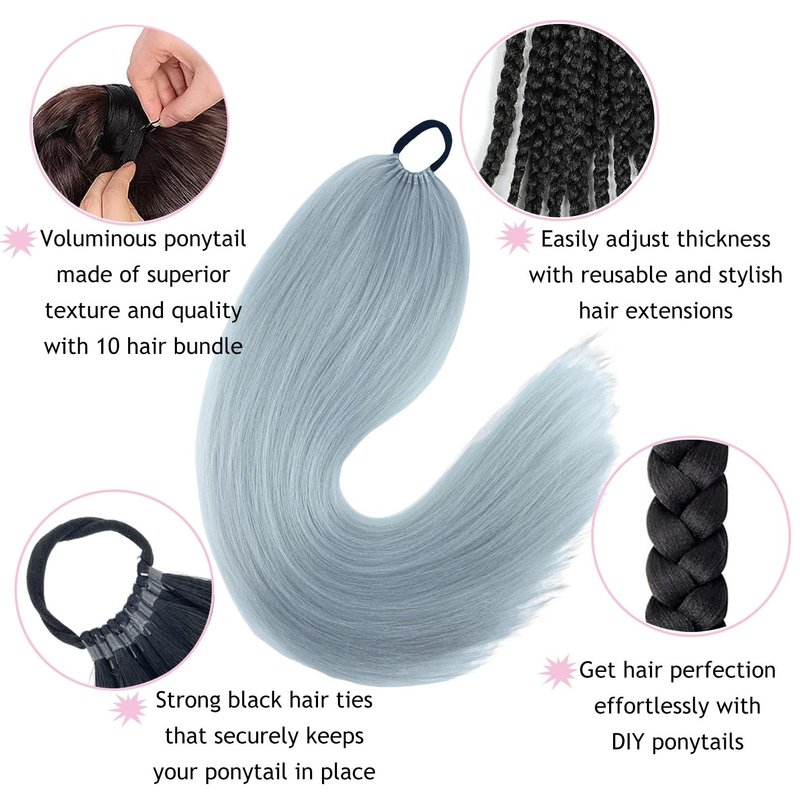 Kediciz Ponytail Extension Warp Around Pony Tail with Hair Tie 24inch Long Synthetic Yaki Straight Braiding Hair Ponytail DIY Braided for Women Girls Daily Party Cosplay,Slivey Grey