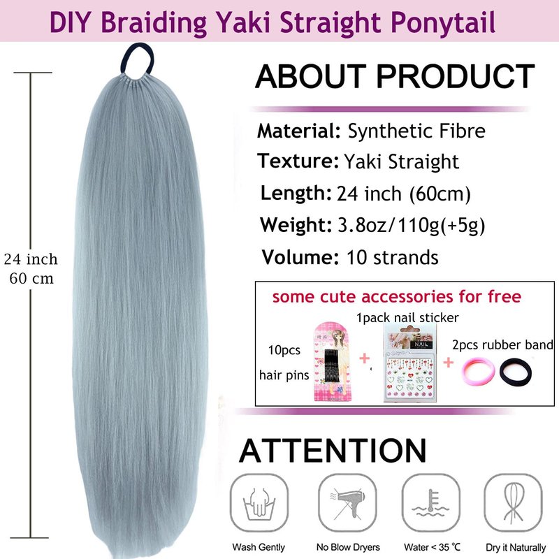 - EXQUISITE HAIR PONYTAIL:Package:1pc and some rubber band and hairpin.Yaki Straight hairpiece for women girls, 24 inches long, 110g weight, 10 strands, length can be cut. Hair extensions ponytail , wigs and hair accessories,Exquisite braid hair ornament is trendy hairstyle design tools which was easy to put on and off just like traditional rubber band, save much more time to create different hairstyle