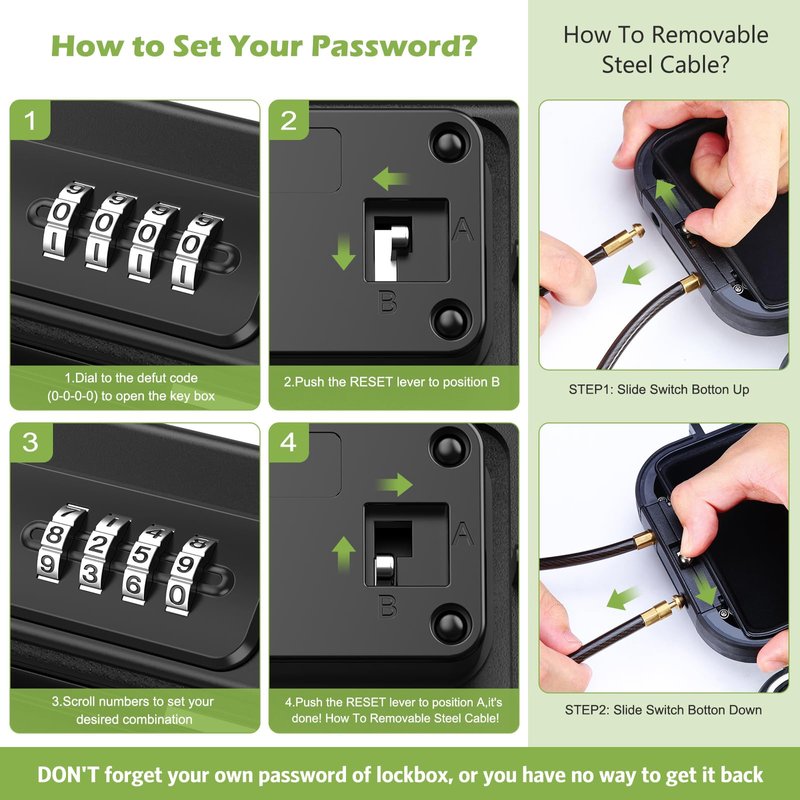 How to set new code? ① Dial to the default code(0-0-0-0) to open the key box. ② Push the RESET lever to position B. ③ Scroll numbers to set your desired combination. ④ Push the RESET lever to position A, it’s done! How to remove the steel cable? 1.Push this button to the left,pull up the left shackle 2.Push this button to the right,pull up the right shackle Package Included: 1 x Portable Safe Box 1 x Security Steel Wire Cable