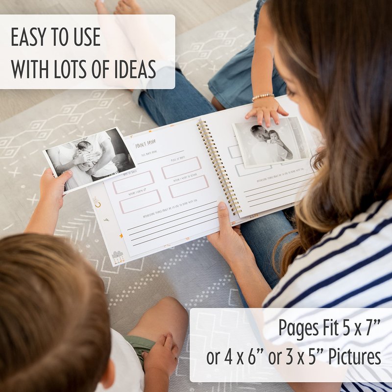 - Adorable Premium Design & Easy To Fill In: The baby scrapbook with lovely illustrations & quotes will guide you through all occasions! The baby memory book is made of high-grade paper & comes in a hard cover ring binder (8.66X8.66”) with an extra back pocket for small keepsakes like hospital wristbands