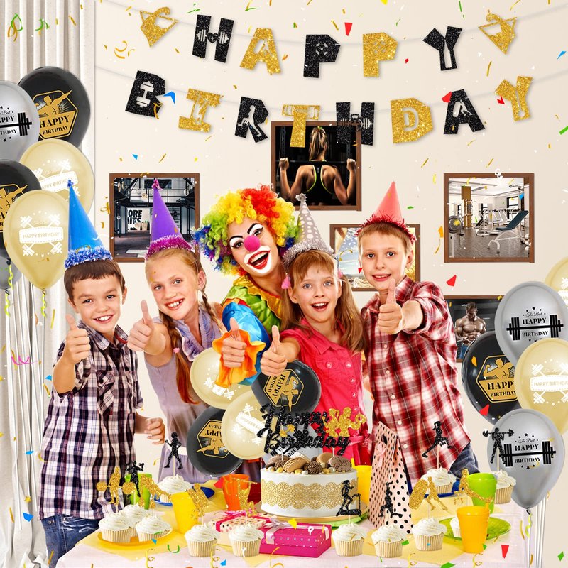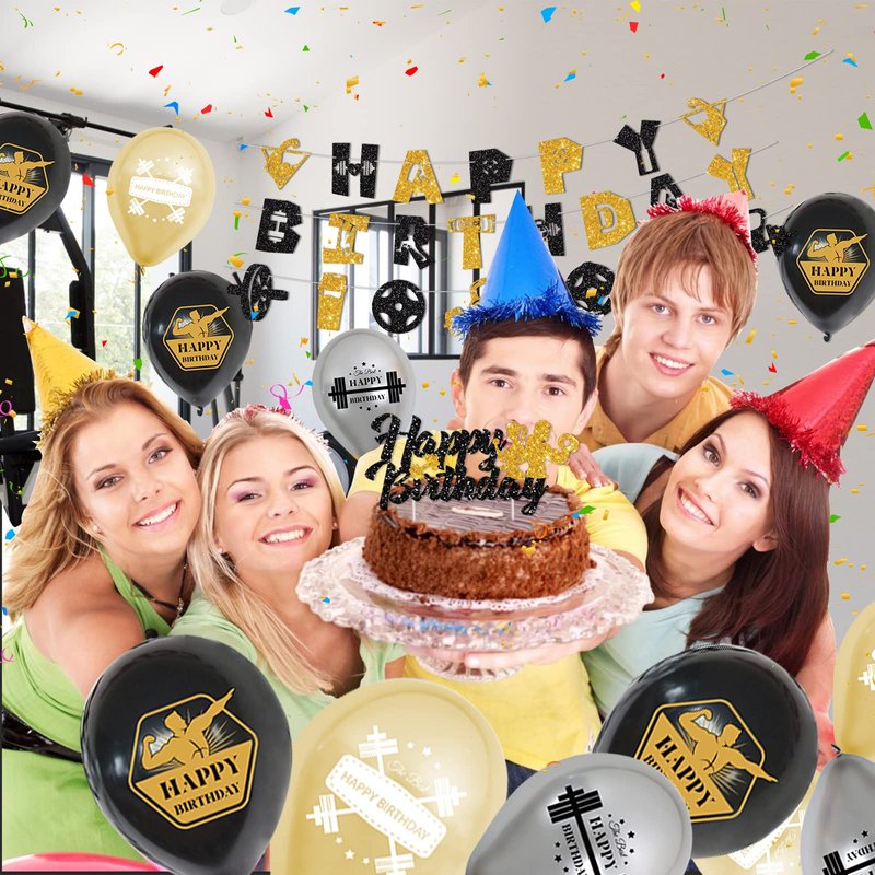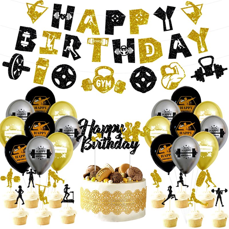 - Fitness themed party decorations include: you will get 1x Happy Birthday banner, 6x gold balloons, 6x black balloons, 6x silver balloons, 1 x gym equipment element Glitter banner, 12 x cupcake toppers, 1 x Happy Birthday cake topper