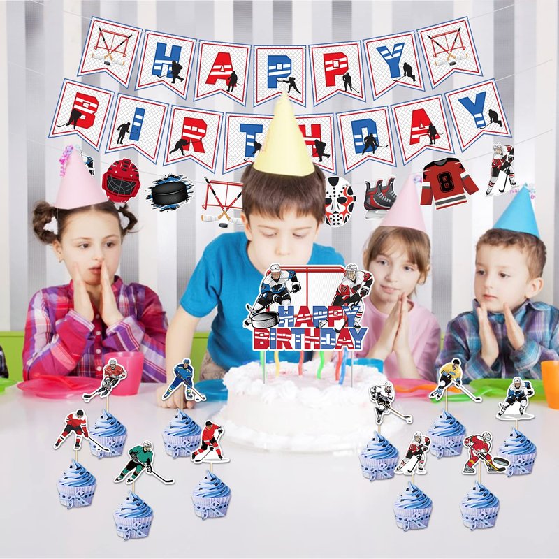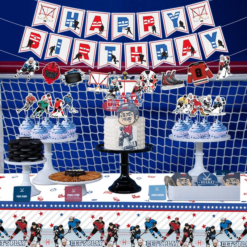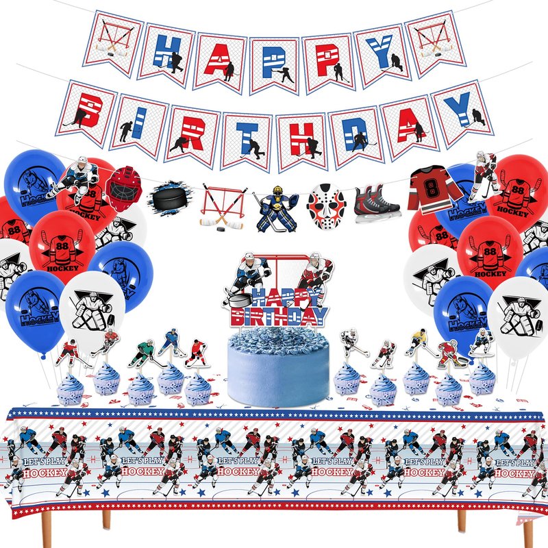 - Hockey birthday party supplies include: 1 HAPPY BIRTHDAY Hockey Banner, 1 Hockey Graphic Banner, 10 Small Cake Toppers and 1 Large Cake Topper, 1 Hockey Tablecloth, 18 Hockey Graphic Latex Balloons (6 each in 3 styles) , perfect for decorating a hockey-themed party, and can give your birthday party a festive vibe