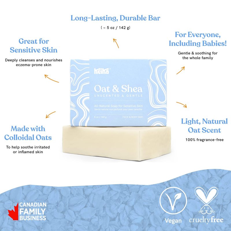 Keika Baby Soap Bar Oat & Shea Unscented for Eczema, Psoriasis, Face, Body, Infant Kids Teens Men Women with Sensitive Skin, 5 oz.