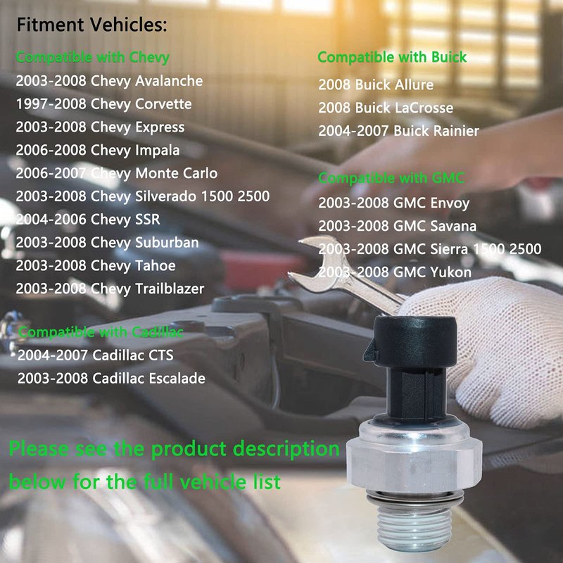 - Compatible With: The Oil Pressure Sensor 12677836 fit for 2004-2007 Buick Rainier, 2004-2007 Cadillac CTS, 2003-2008 Chevy Avalanche, 1997-2008 Chevy Corvette, 2003-2008 Chevy Silverado, 2003-2008 Chevy Suburban, 2003-2008 Chevy Trailblazer, 2003-2008 GMC Envoy, 2003-2008 GMC Sierra, 2003-2008 H2 H3, 2005-2008 SAAB 9-7X and more. Please See description below for the full vehicle list.