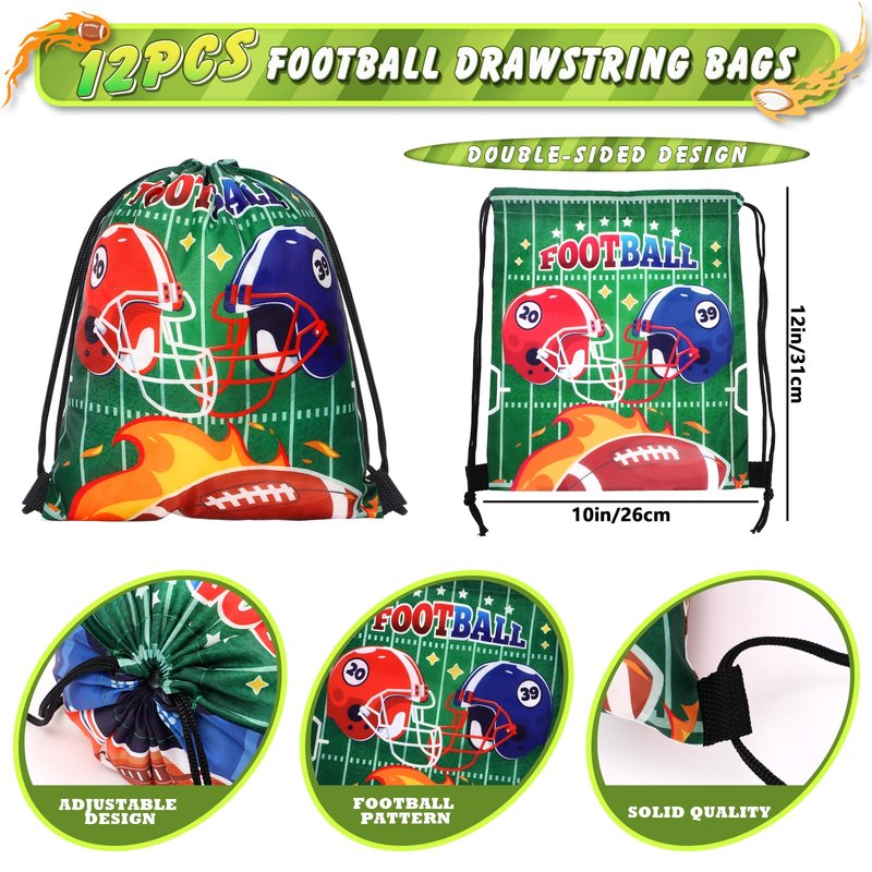 - EXCITING THEME DESIGN: Our football party supplies kit is our carefully customized product. The drawstring backpacks come in 8 intricate designs printed various football related patterns on the front and back like footballs, helmet and trophy. You can adjust the size of the backpack opening by pulling on the string, perfect for holding all the exciting party gifts, and for your little guests to take home their goodies