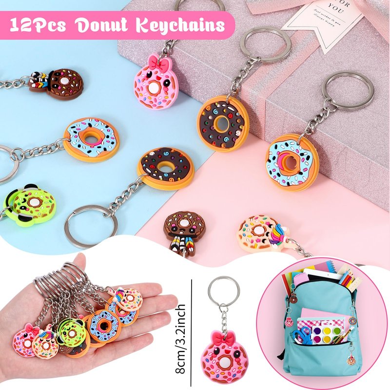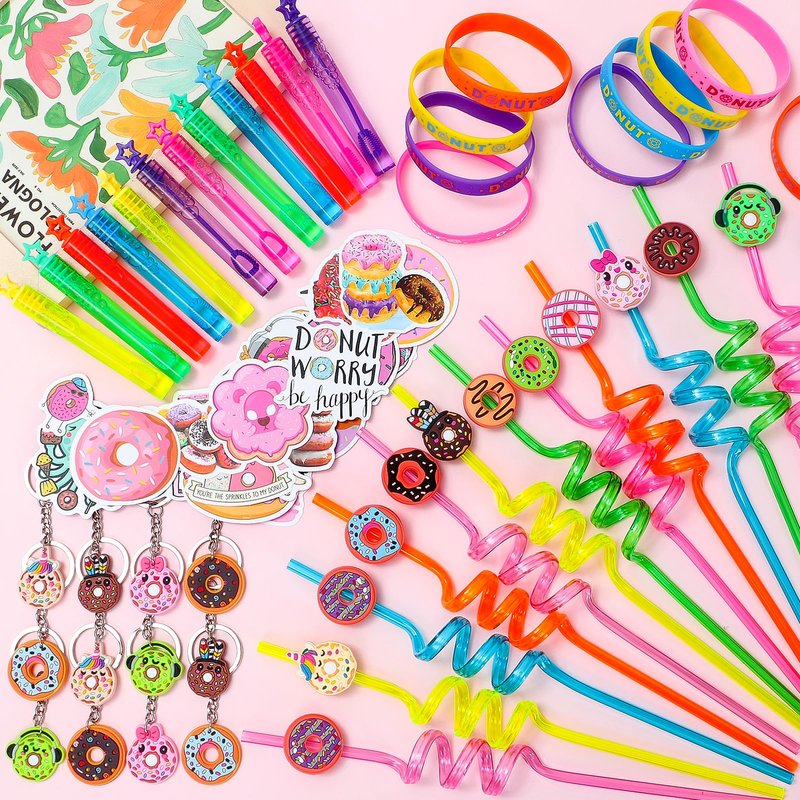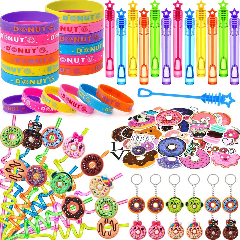 - Amazing Donut Party Favor Set: Our 98 donut party favor set includes 12 donut straws (6 styles), 12 donut bubble sticks (6 styles), 50 donut stickers, 12 donut keychains (6 styles), 12 donut silicone bracelets (6 styles). These exquisite donut party supplies will add sweetness and fun to your party, allowing all children to immerse themselves in a sweet atmosphere