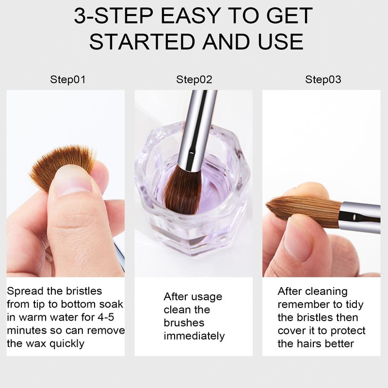 - 【Clean and Storage】After every application on single nail, make sure to clean the acrylic brush with brush cleaner to prevent the acrylic powder from clumping.Do not use acetone, it will remove the shine, make acrylic tacky and buildup residue. After cleaning, remove moisture with a paper towel, reshape, and keep it in the upright position.