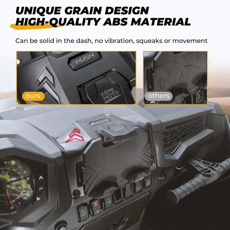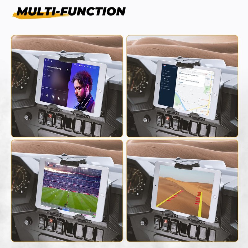 - Adjustable Clamp - Securely hold your tablet, mobile phone, and navigator in place with KEMIMOTO's adjustable clamp that is compatible with most devices (5.1"-8"). The navigation holder is located above the UTV dashboard, allowing you to easily connect your device to the dashboard's power for charging
