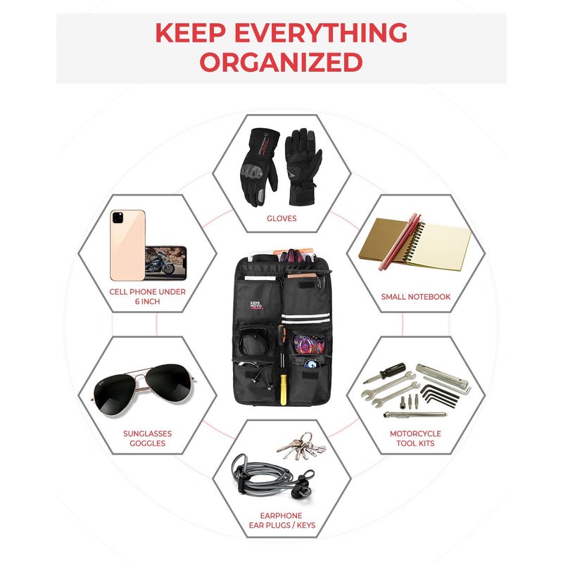 - Multi-pockets for Storage - Lots of different pockets for putting different kinds of items. such as cell phones, keys, wallets, gloves, lock, goggles, registration and insurance documents