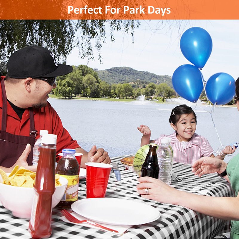 - Functional & Beautiful: With bright colors, flannel backing and classic red-white Buffalo checkered patterns, this vinyl tablecloth not only gives your table a new stylish look, but also protects your table from scratches, beverage spill, and kids arts & crafts mishaps, making your table last longer. The elasticized edges keep the vinyl tablecloth tightly fitted and stay free from moving / falling off. It works in both dining room and outdoor settings.