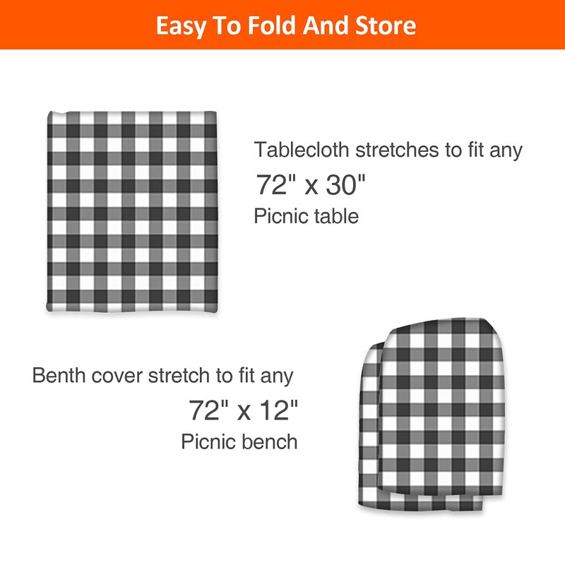 - 3 Pack Set Includes: 1 Tablecover and 2 Bench Seat Cover. Tablecloth stretches to fit any 72" X 28" picnic table or trade show table, bench cover stretches to fit any 12" X 72" bench. The vinyl cover is fitted with elastic stretchable corners, to offer a snug and tight fit so the cover remains in place securely, all three pieces boast a slightly larger cut for a better fit.