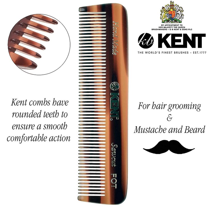 ABOUT KENT HANDMADE COMBS: Kent Handmade Combs for Men and Women Range are of excellent quality. Kent hand sawn combs are cut from large sheets of cellulose acetate rather than moulded, producing a truly gentle comb whereas moulded combs often snag and damage the hair. This material is tactile, flexible and strong. They glide effortlessly through hair without scratching to damaging the hair or scalp. Kent combs have rounded teeth which ensure a smooth and comfortable action. The range includes designs for thick and fine hair, in varying sizes, for both men and women. About Kent: Founded in 1777, Kent Brushes is the world's oldest hairbrush manufacturer and has maintained its British traditions of producing the world's finest hairbrushes and combs ever since. Making the best quality brushes for over 230 years and creating over 250 products. Quality, design and attention to detail go into each brush. They have been the holders of The Royal Warrant through the last nine consecutive reigns of British monarchy. The company continues to retain the craftsmanship and unprecedented quality that is Kent's reputation.Even in today's fast moving, mass-produced assembly lines, they are proud to still be manufacturing many of their original brushes by hand.
