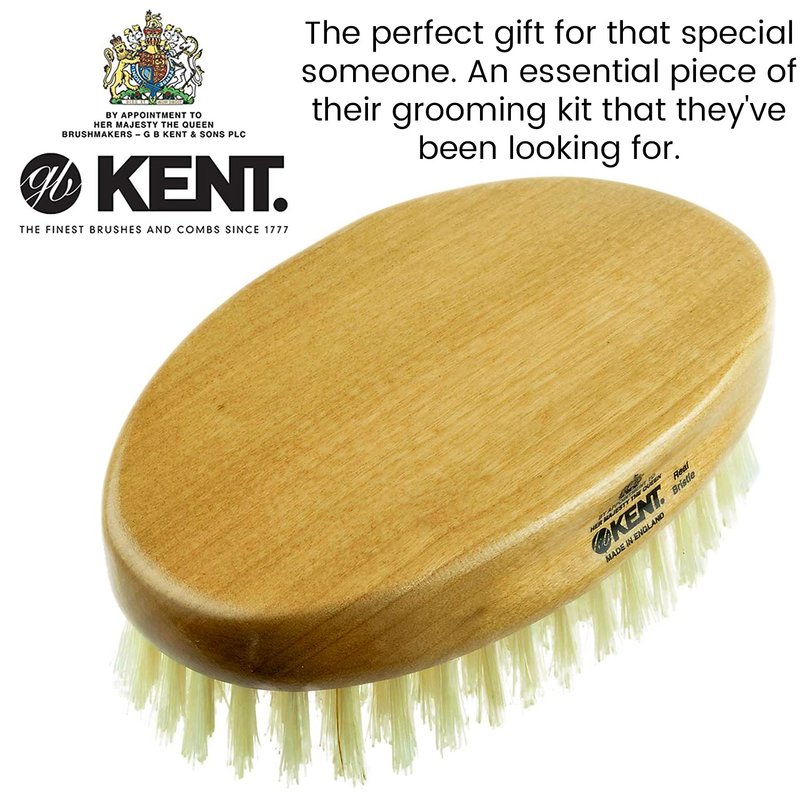 Made in the UK, this beechwood brush is specially made with natural boar bristles that give this brush unparalleled quality and durability. This brush can handle the coarsest of facial foliage, while still being gentle on your skin. The brush is an oval shape that fits perfectly in the palm of your hand for comfort and control. Suitable for left handed and right handed gentleman. About Kent: Founded in 1777, Kent Brushes is the world's oldest hairbrush manufacturer and has maintained its British traditions of producing the world's finest hairbrushes and combs ever since. Making the best quality brushes for over 230 years and creating over 250 products. Quality, design and attention to detail go into each brush. They have been the holders of The Royal Warrant through the last nine consecutive reigns of British monarchy. The company continues to retain the craftsmanship and unprecedented quality that is Kent's reputation.Even in today's fast moving, mass-produced assembly lines, they are proud to still be manufacturing many of their original brushes by hand. Features: Pure Boar Bristle (hand trimmed top, machine sown base) Gloss sprayed beechwood back, cherry wood base Curved handle for a comfortable grip Suitable for all hair types Benefits: Pure boar bristle has microscopic scales that help grab the natural oils from the scalp and distribute them down the hair shaft to promote shine and smoothness. Hand trimmed boar bristle allows each bristle to be cut at a slightly different length, which creates an uneven surface to the brush. This enables it to penetrate hair perfectly reaching deep down to the scalp. Gloss sprayed treatment helps protect wood and wears well over time.