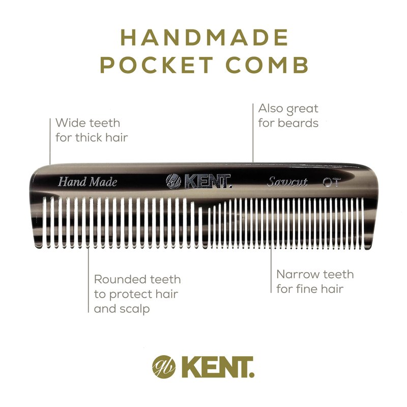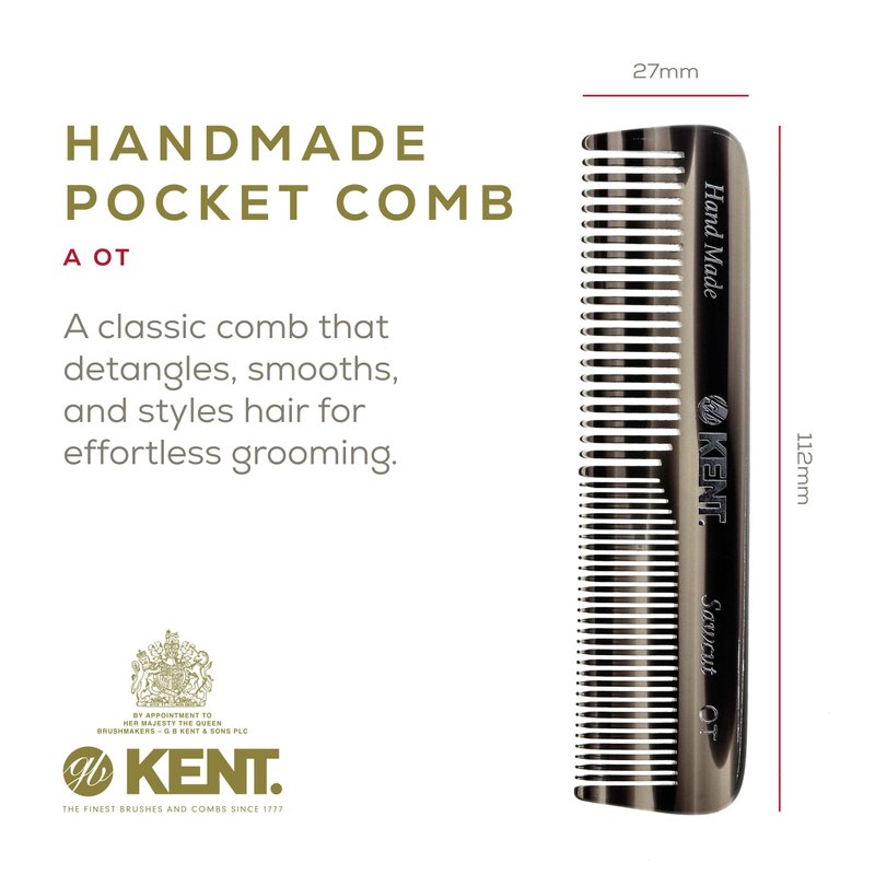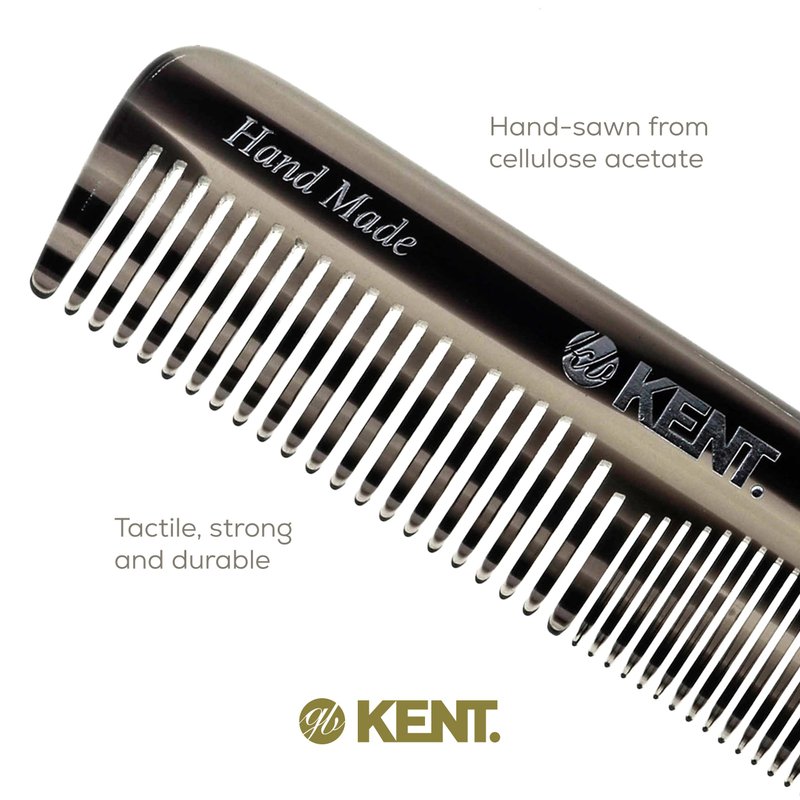 ABOUT KENT'S HANDMADE COMBS: Kent Handmade Combs for Men and Women Range are of excellent quality. Kent hand sawn combs are cut from large sheets of cellulose acetate rather than moulded, producing a truly gentle comb whereas moulded combs often snag and damage the hair. This material is tactile, flexible and strong. They glide effortlessly through hair without scratching to damaging the hair or scalp. Kent combs have rounded teeth which ensure a smooth and comfortable action. The range includes designs for thick and fine hair, in varying sizes, for both men and women. About Kent: Founded in 1777, Kent Brushes is the world's oldest hairbrush manufacturer and has maintained its British traditions of producing the world's finest hairbrushes and combs ever since. Making the best quality brushes for over 230 years and creating over 250 products. Quality, design and attention to detail go into each brush. They have been the holders of The Royal Warrant through the last nine consecutive reigns of British monarchy. The company continues to retain the craftsmanship and unprecedented quality that is Kent's reputation.Even in today's fast moving, mass-produced assembly lines, they are proud to still be manufacturing many of their original brushes by hand.