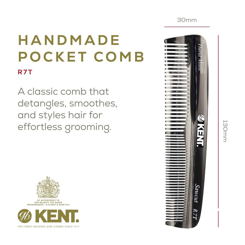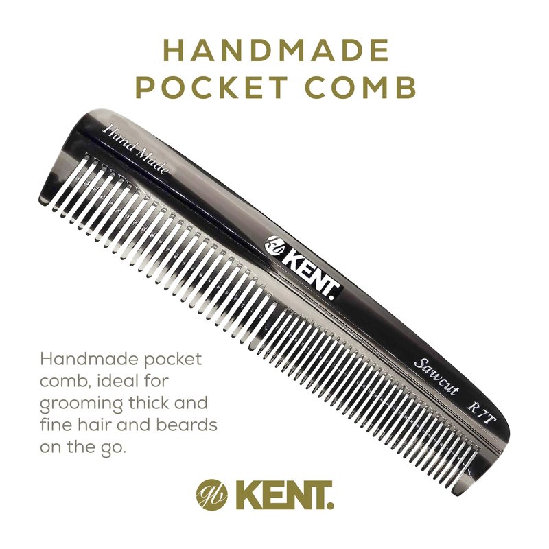 Kent R7T Fine and Wide Tooth Hair Comb, Handmade Pocket Comb for Men, Best Beard Comb and Mustache Comb for Everyday Grooming and Styling, Sawcut Kent Comb, Made in England