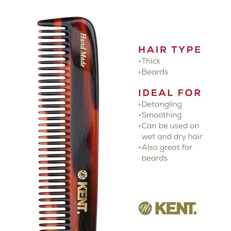 - Handmade Kent comb: Handmade from a large sheets of cellulose acetate rather than being molded. This material is tactile, flexible and strong, a non-petroleum based derived from plants that has been found to create less static in hair, and is saw-cut to ensure a smooth surface that will not pull or snag hair follicles