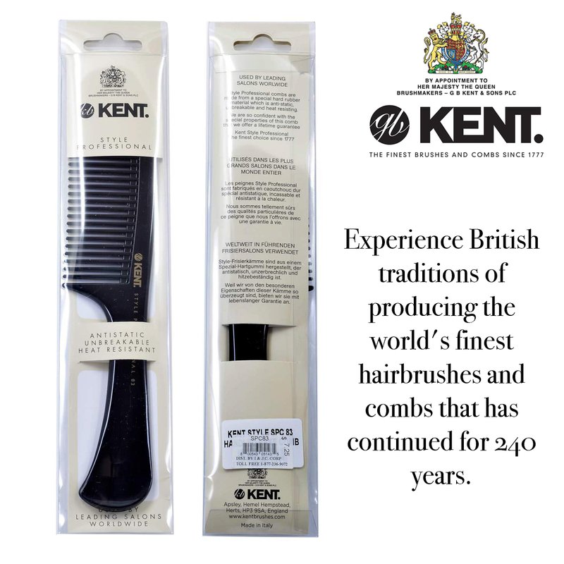 THE KENT PROFESSIONAL BLACK LINE: Kent has been making and improving upon classic comb and brush designs since their introduction in 1777. They received the majesty's royal warrant and have held the title for three centuries, and their masterful quality has made them the industry's leader in artisan crafted combs. These combs, the Kent Professionals line, not only carry with them a legacy of more than 300 years of perfection but also sleek salon quality for any hair type. Each of these combs is specialized, the SPC80, 81 and 85 wine/fine combs handcrafted for daily grooming of wet or dry hair. SPC82 is used to part hair, and can section away troublesome curls or loose hair. SPC83 is the detangler of the line, allowing you to prepare your hair for further combing and brushing or shaping thick hair. SPC86 adds volume to both wet and dry thick hair, amplifying your hair's natural waviness without causing static or tearing.