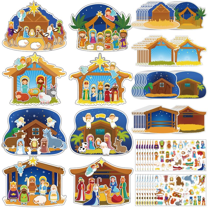 - PACKAGE INCLUDE - For each Christmas nativity craft kit, you will get 64 pieces of scene cards designed in 8 styles, coming with 576 pieces of self-adhesive stickers in 16 big sticker sheets for DIY.