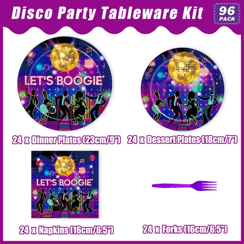 - Retro Theme Design: Get the party started with our retro and interesting style design! The 70s disco party tableware kit is made of 70s themed elements, such as music records, disco balls, dancers and other patterns, and features "Let's Boogie" slogan printed on the items. Disco party bundle are a hit with people of all ages, making them be a great decoration for 70s, 80s and 90s party