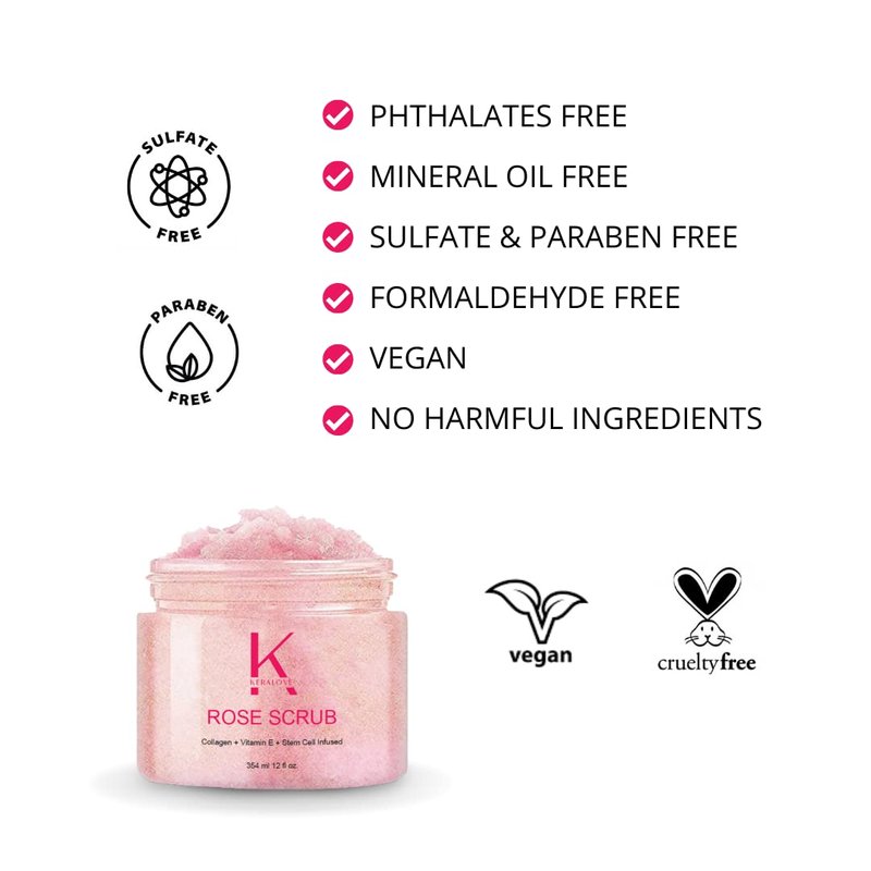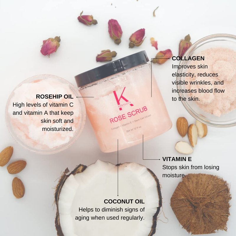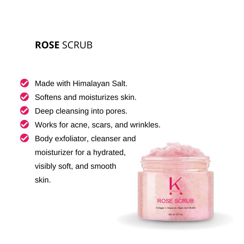 Keralove Rose Scrub with Collagen and Stem Cells 12 oz - Exfoliating Himalayan Salt Scrub for Cellulite - Deep Cleansing for Acne, Scars, Wrinkles - Moisturizes Skin