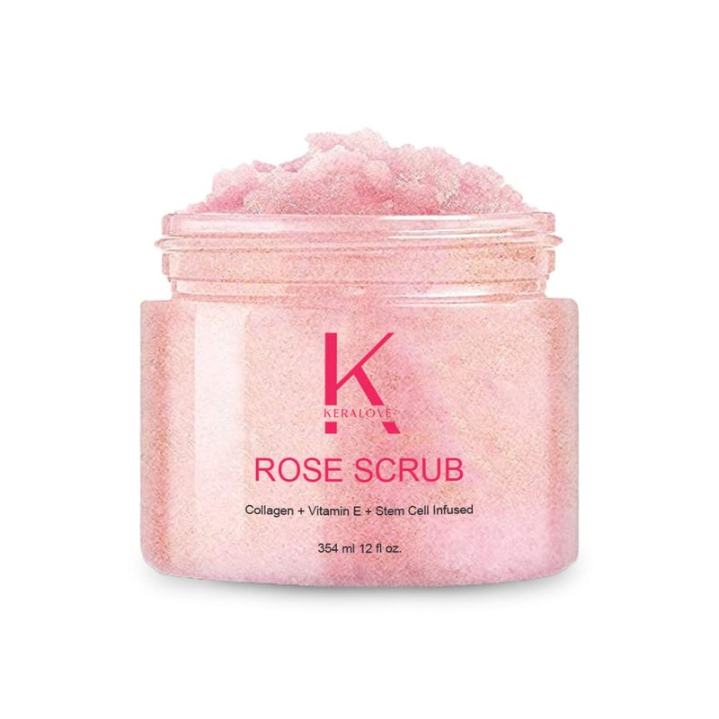 KERALOVE Rose Scrub restores natural soft skin while scrubbing away unwanted toxins and dead skin cells boosting natural collagen production, and increasing skin cell longevity, and delivering unmatched anti-aging skin results. Detoxifies skin by balancing its pH levels and acting as a pore-minimizer to restore smooth, soft skin. Apply to damp or dry skin. Massage onto skin using circular motions for even coverage and effective exfoliation. Rinse well.