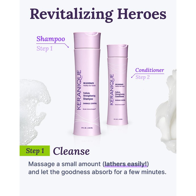 Introducing the Keranique Damage Control Shampoo, the ultimate solution to repair and revive damaged hair. Our non-stripping, ultra-mild shampoo for thinning hair and hair loss combats the effects of mechanical, thermal, and chemical processes, transforming your hair into stronger, more resilient locks. Say goodbye to dry, breakage-prone hair, and hello to soft, manageable locks. Reduce signs of shedding with intensive anti-damage Keranique shampoo for damaged, thinning hair. By improving combability and preventing heat damage, it helps minimize shedding and reduces the risk of secondary hair loss. Our vitamin-enriched routine hairfall control shampoo for women hair loss and hair breakage is backed by science and powered by nature. This lightweight shampoo for extremely damaged frizzy hair features a conditioning blend of fortifying Biotin, calming Bisabolol, and Panthenol serving as damage prevention, among other potent ingredients. Together, they nourish your damaged hair from within, restoring its natural beauty and vitality. Enriched with our proprietary repairing Keratin Amino Complex, Keranique Damage Control Protein Shampoo strengthens and thickens each hair shaft, enhancing volume and providing protection for all hair types. Whether your hair is dry, thin, brittle, curly, bleached, 4c, or color-treated, our rich formula delivers exceptional results. At Keranique, we believe that self-care starts with your hair. Trusted by a community of over 2 million women worldwide, our hair products are designed to deliver life-changing solutions for hair thinning. Join the countless women who have experienced the transformative power of Keranique. Let our hair care products be your self-care ritual, and create the foundation for fuller hair growth. Repair, restore, and rejuvenate your damaged hair with Keranique anti-frizz sulfate-free shampoo. Embrace professional salon-like results from the comfort of your own home.