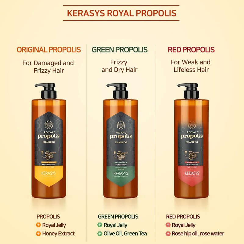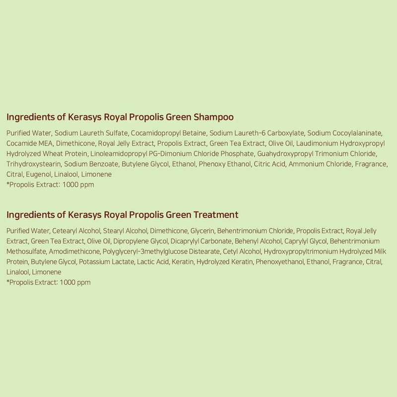 - Kerasys Propolis Royal Jelly Extract Green Tea Olive Oil Shiny and Healthy Hair Propolis Green Moisture 33.8 fl oz / 1L