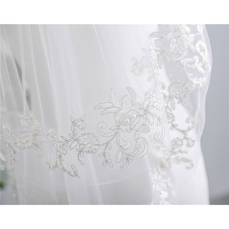 Kercisbeauty 2 Tiers Wedding Bridal Lace Double layer Veil Drop with Hair Comb Flower Lace and Pearl Chapel Hair Accessories (White)