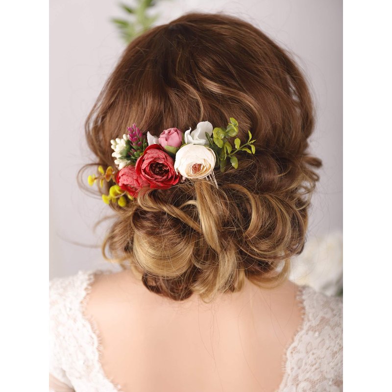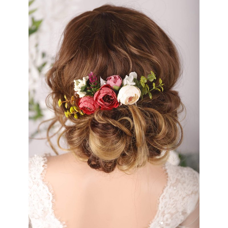 Kercisbeauty Handmade Boho Hair Comb for Brides Floral Red Flower Hair Accessories Woodland Garden Wedding Hair Piece for Women Girls Evening Party