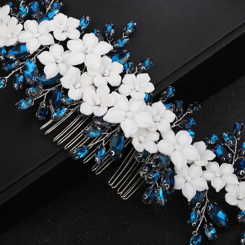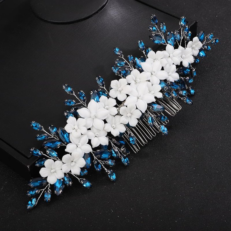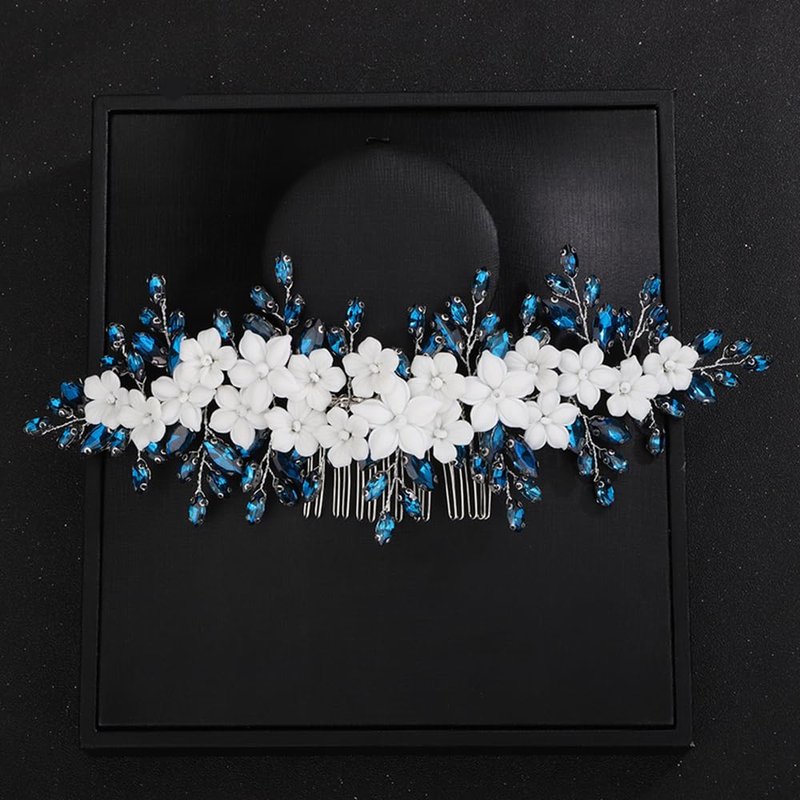 Kercisbeauty Rhinestones Beads White Flower Statement Hair Comb for Wedding Brides Bridesmaid Women Girls Special Ocaasion Jewelry (Sky)