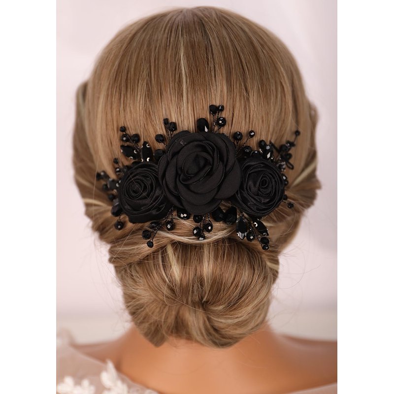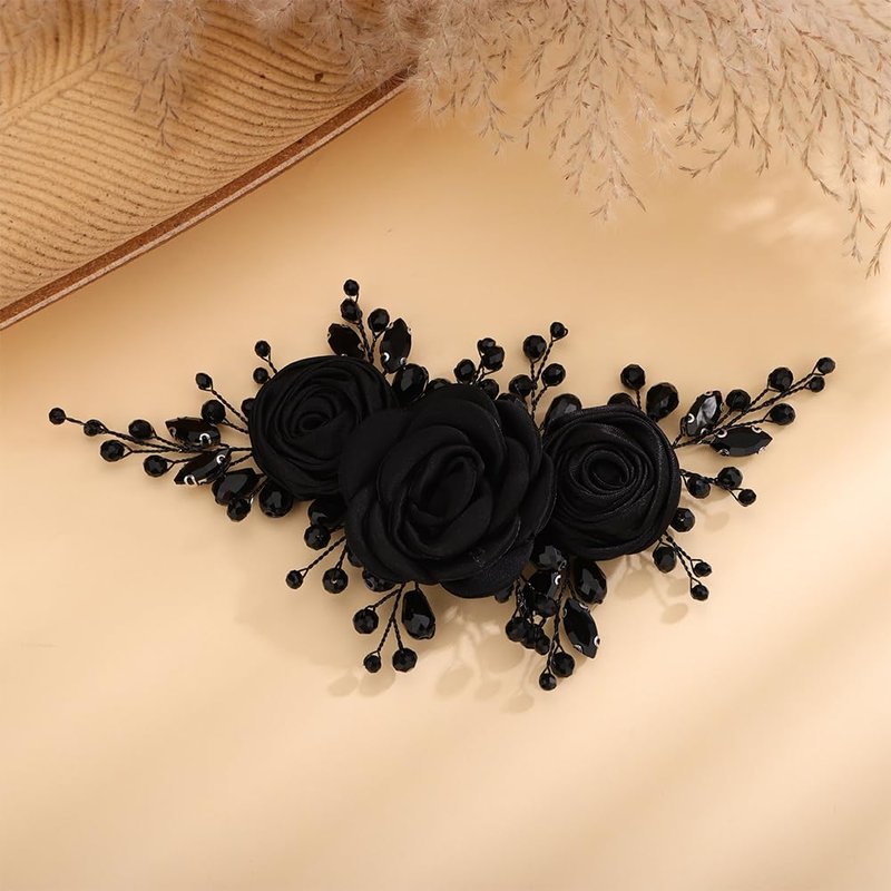 Kercisbeauty Sofe Chiffon Black Rose Flower Headband with Rhinestones Crystal Beads Women Girls Handmade Black Hair Jewelry Wedding Hair Piece