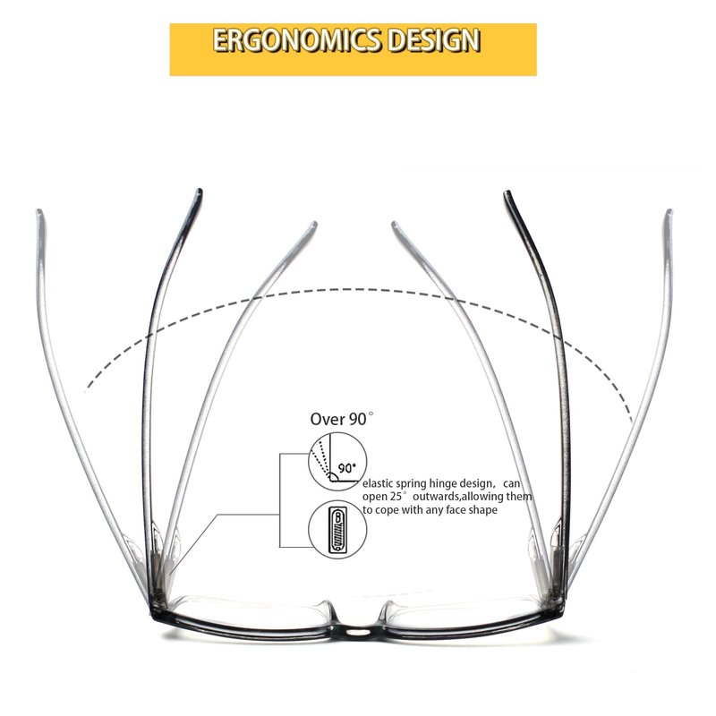 - Spring hinges: These reading glasses come with spring hinges. Compared with traditional reading glasses, the frame of the spring hinged glasses can be opened outward by 25 degrees, reducing the pressure on the head when wearing, and perfectly fitting the face shape. The integrated nose pad design makes it difficult for reading glasses to slide off the face.