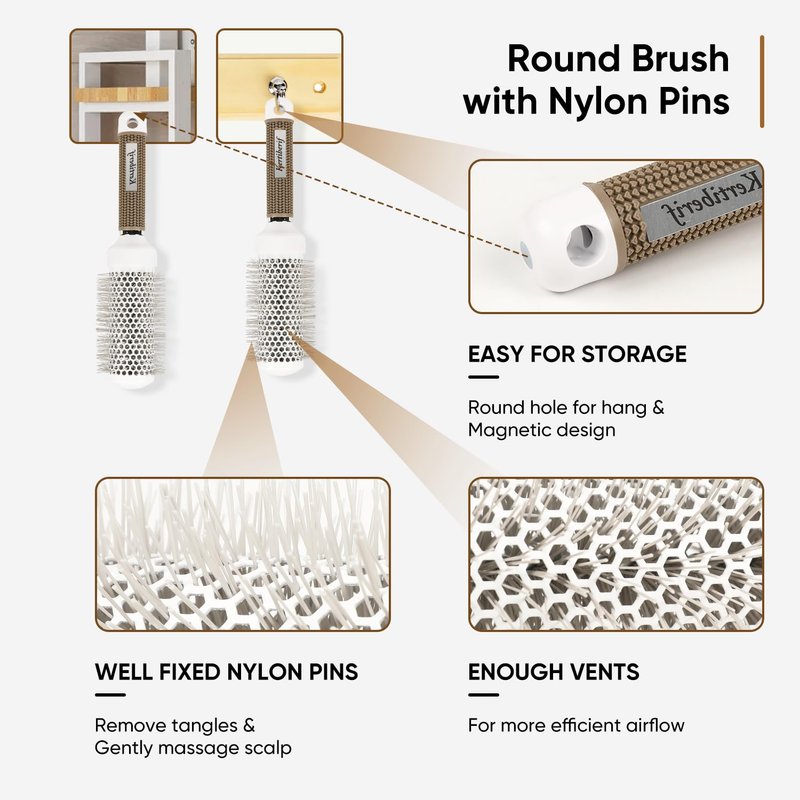 - Anti-slip Handle & Convenient For Storage - With rubber anti-slip handle, these round brushes provide a comfortable grip. And in addition, there is a round hole and a magnetic adsorption design at the bottom of the grip, allowing the comb to be hung on a hook or attached to a metal object. It is very convenient to store in the bathroom, so you don’t have to worry about it being messy.