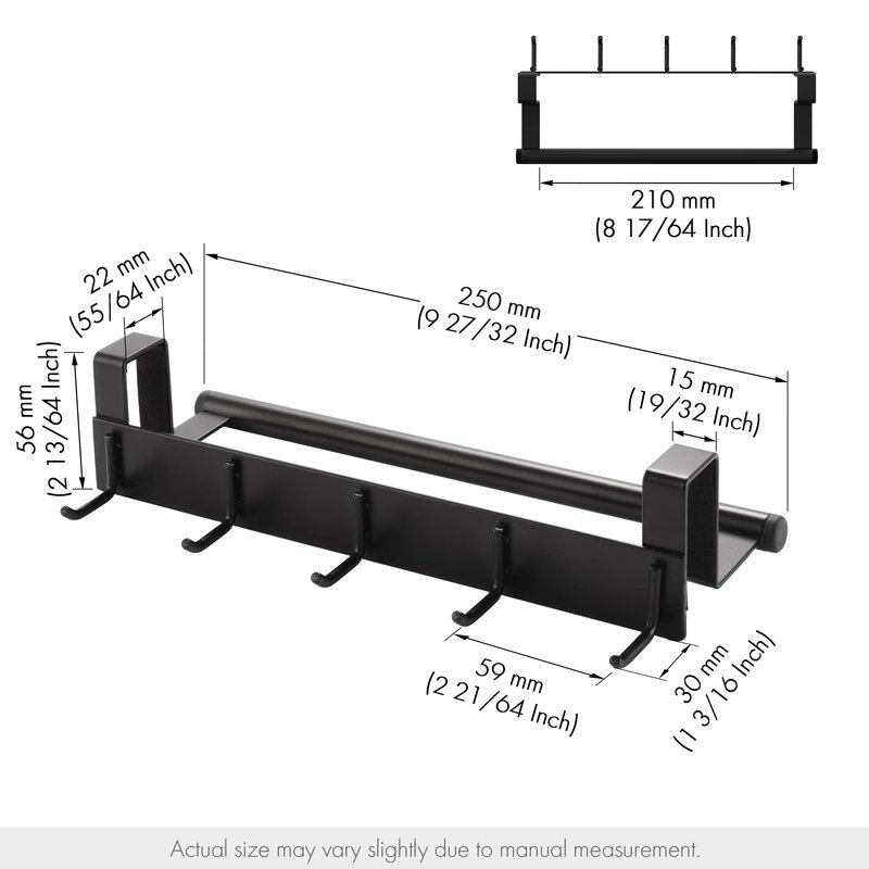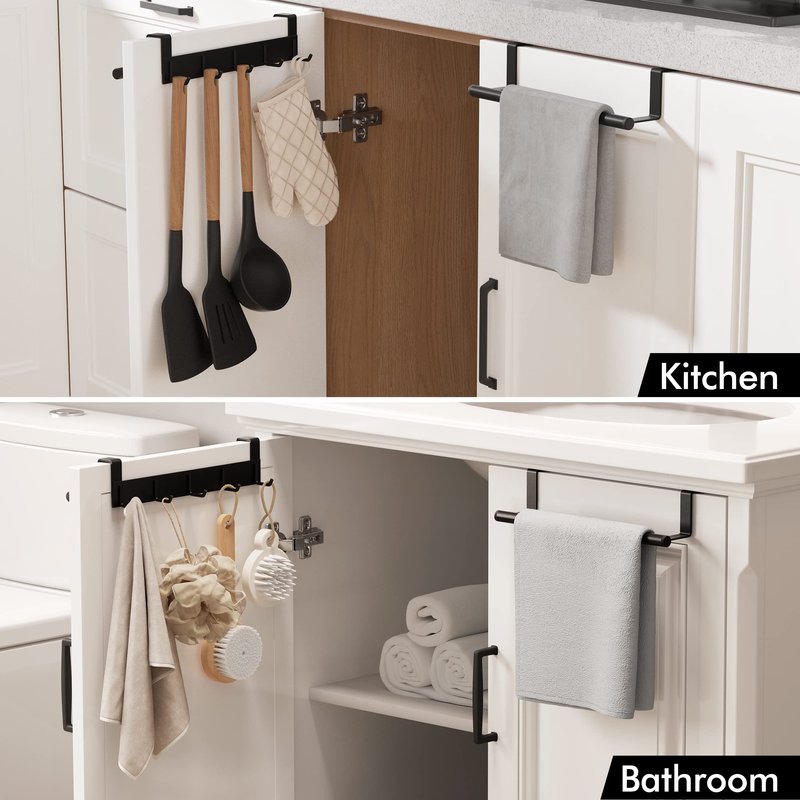 - [Extra Storage Space] This over the cabinet door towel holder has a hand towel bar on the outside and 5 kitchen hooks on the inside, allowing you to hang hand towels and other small items like baking gloves, kitchen scissors, dishwashing brushes and cleaning gloves. It's practical and saves space in your cabinets or bathroom. The distance between the kitchen towel rack and the cabinet door is 1.37" (35mm), and the usable length is 8.27" (210mm) to help dry towels quickly.