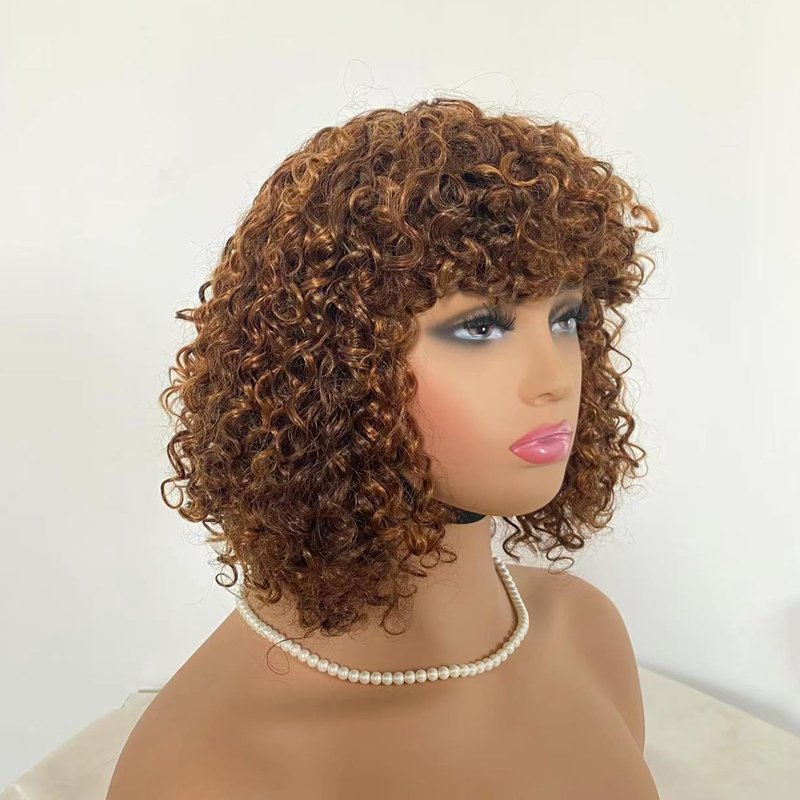 - Bob Curly Human Hair Wig with Bangs Style Density:P4/30 200 Density Machine Made Deep Curly Human Hair Wigs with Bangs