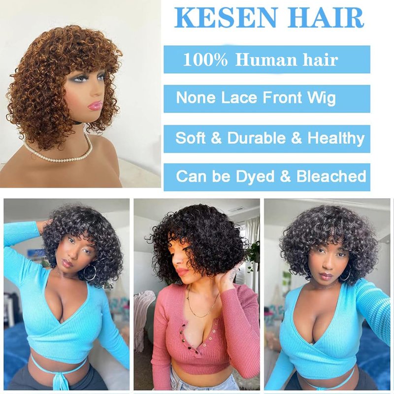 - Human Hair Wigs with Bangs Advantage:Short Deep Curly Human Hair Wigs, Machine Made Wigs,Medium Cap with Adjustable Strap and 4 Combs, Durable, Easy to Adjust.More Healthy & Comfortable & Breath