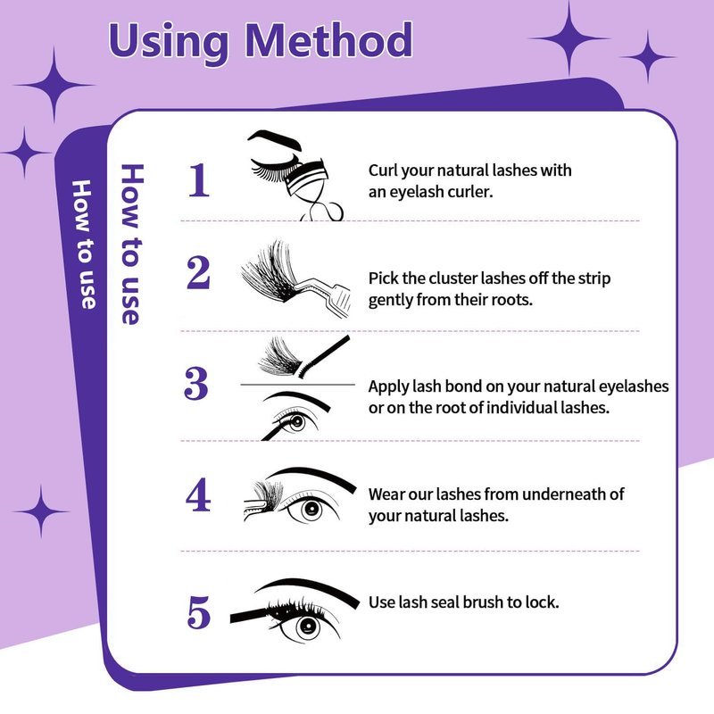 - 💖 Easy Application Tips: 1. Use tweezers to gently roll the lash band down 2. Apply the lash adhesive sheet to your natural lashes 3. Place the lash cluster under the lashes 4. Use a lash sealing brush to lock in