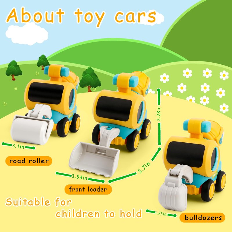 - Toddler Construction Vehicle Toys Set:This 3-piece toddler construction toys set includes a bulldozer, road roller and toy excavator, 2 year old boy toys, each of which is full of endless fun. Toddler car are modeled after real construction trucks with bright colors and cute shapes, kids construction toys will immediately catch your baby's attention,These toddler boy toys work on your child's fine finger skills, bring car toys for toddlers 1-3. Best gifts for 3 year old boys