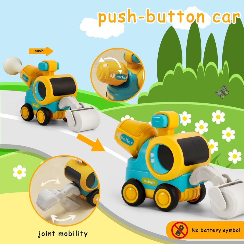 The unique feature of this toys for the car is its press and go cars design. Simply press the top of the kids toy cars gently and it will automatically move forward, just like a lively little guy waiting for instructions from the kids. Cars for kids ages 3-5, This simple yet fun design requires no batteries or other aids, kids toy cars can stimulate your baby's interest in engineering and construction while playing.