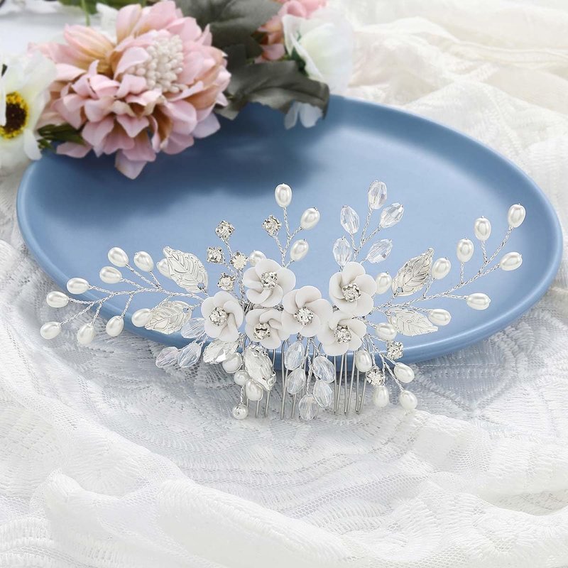 Kesvb Flower Bride Wedding Hair Comb Silver Pearl Bridal Side Comb Crystal Hair Piece Leaf Hair Accessories for Women and Girls