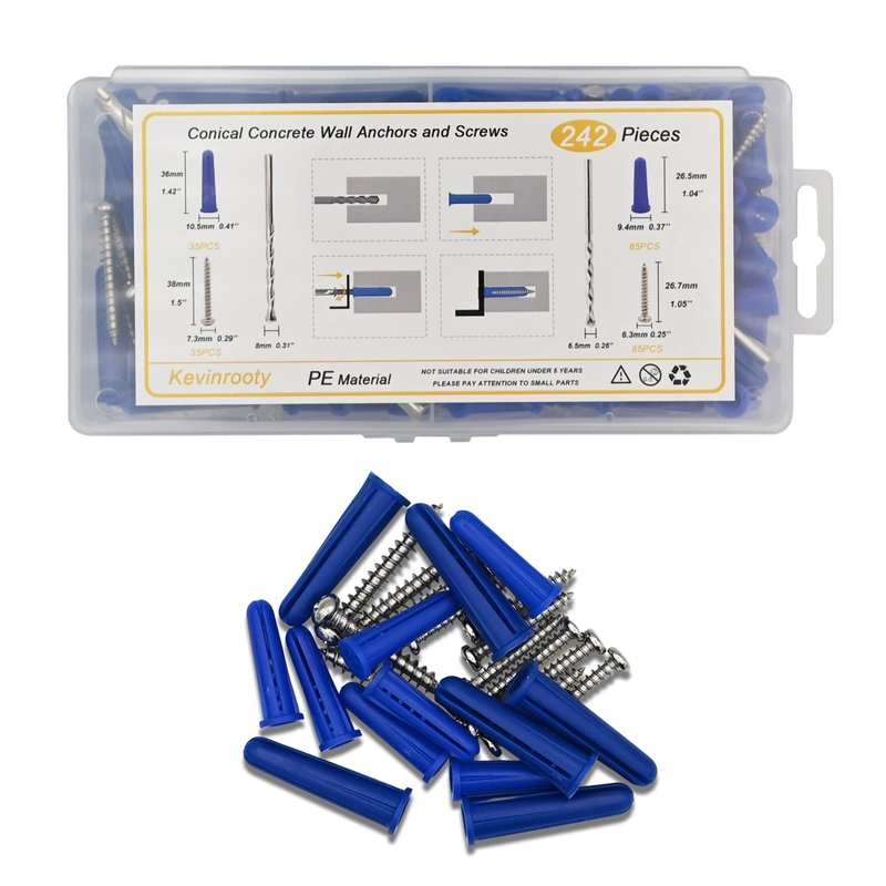 Kevinrooty Conical Concrete Wall Anchors and Screws Kit,240 Pcs Wall Anchors and Self Tapping Screw with 2 Pcs Masonry Drill Bits,for Stucco Concrete Masonry Brick Wall.