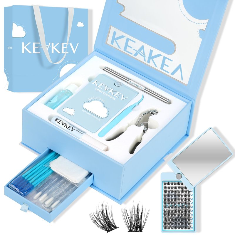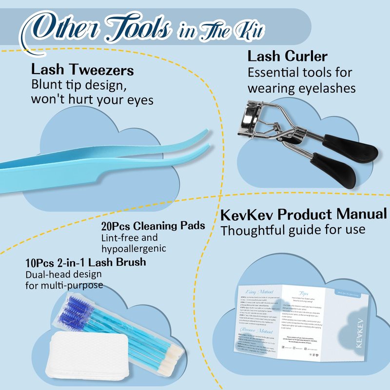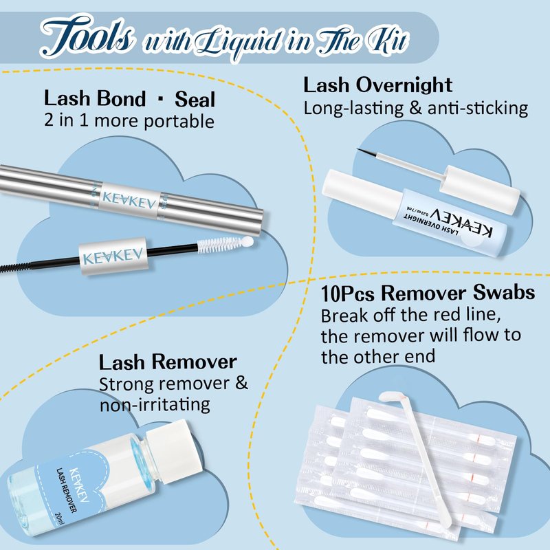 - 10 in 1 Lash Extension Kit: With KevKev lash clusters kit, you will get 96pcs cluster lashes, 1 lash curler, 1 lash tweezer, 1 double-ended lash bond and seal, 1 lash overnighter, 1 nice lash remover and other useful little eyelash tools. With KEVKEV eyelash extension kit, you can easily get eyelash extensions at home and create your own eyelash style.