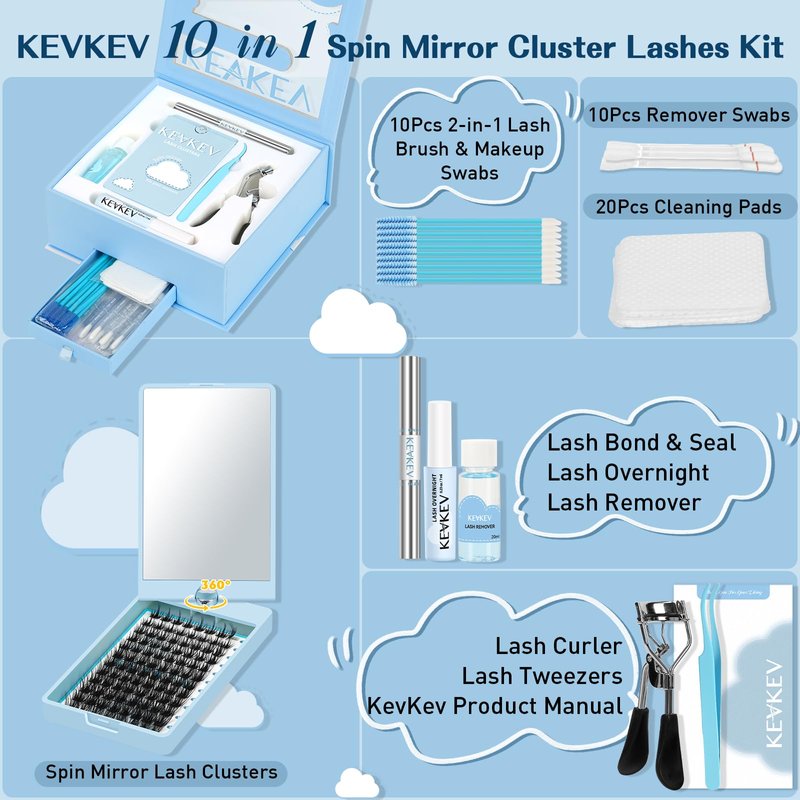 KevKev Lash Extension Kit 96Pcs Lash Clusters with 360 Spin Mirror Eyelash Extensions Kit with Lash Curler Individual Lashes Kit Lash Bond and Seal Lash Applicator Lash Remover (Cloudy, 10-16mix)