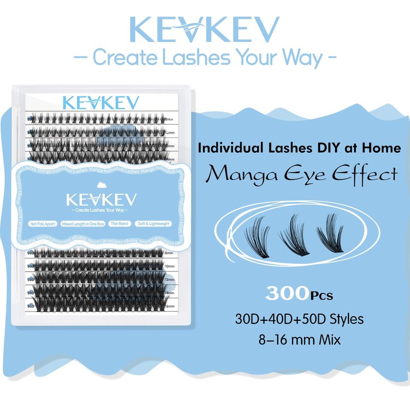 KevKev Lash Clusters Manga Individual 30D+40D+50D 300Pcs Eyelash Clusters Eyelash Extensions 8-16 Mixed Cluster Lashes Thin Band & Soft (Manga 30+40+50D,D-8-16mix)