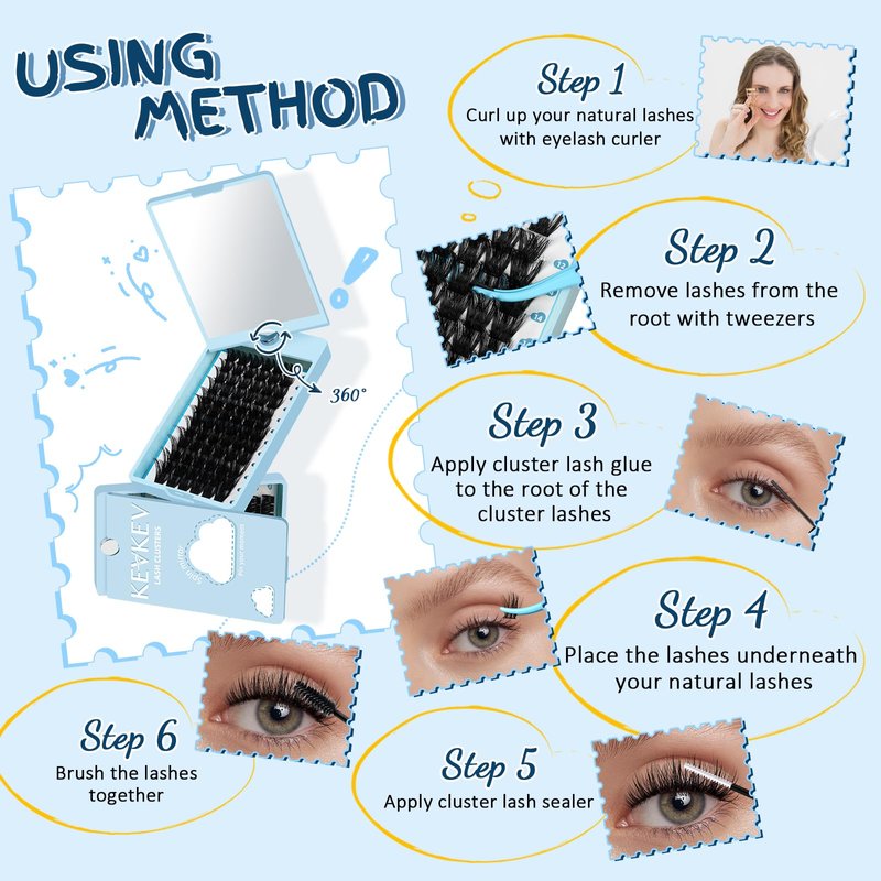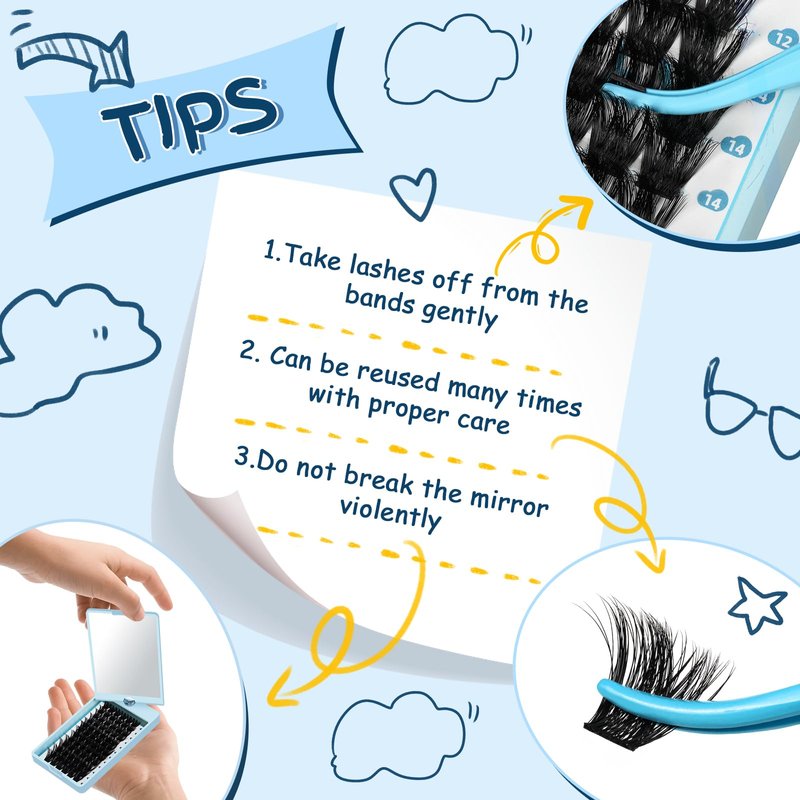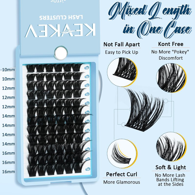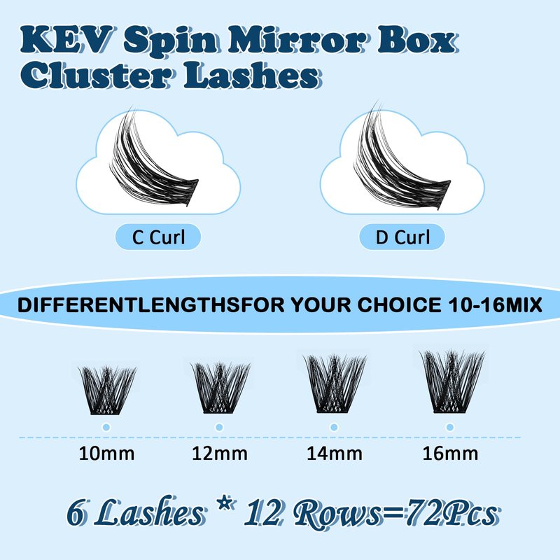 KevKev Lash Clusters 72 Pcs Cluster Lashes Special Spin Mirror Case DIY Lash Extension Soft & Comfortable Eyelash Clusters Thin Band Eyelashes with Mirror Easy to Apply (Cyclone,C-10-16mix)