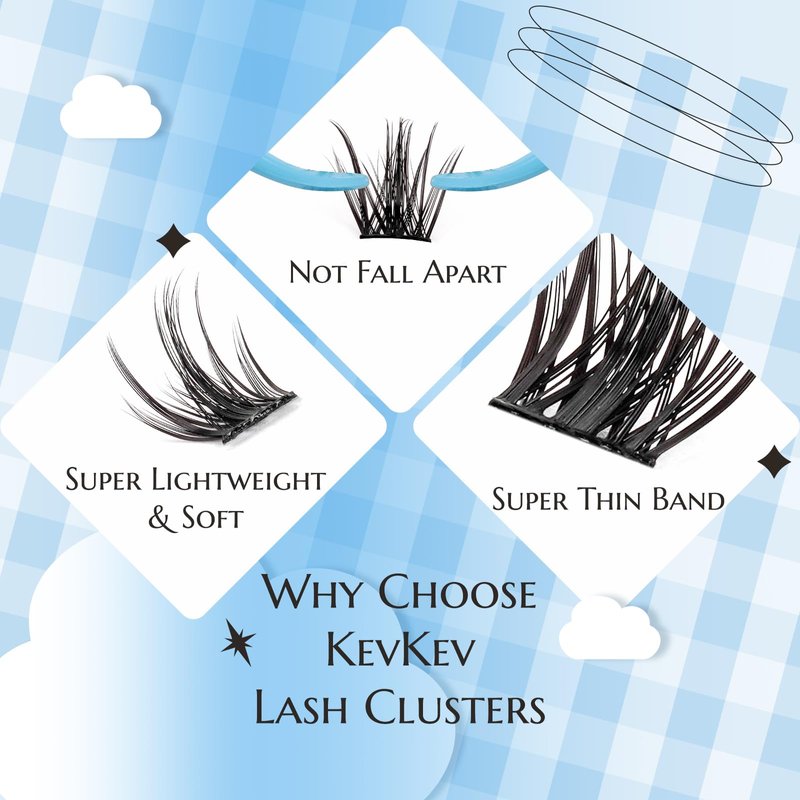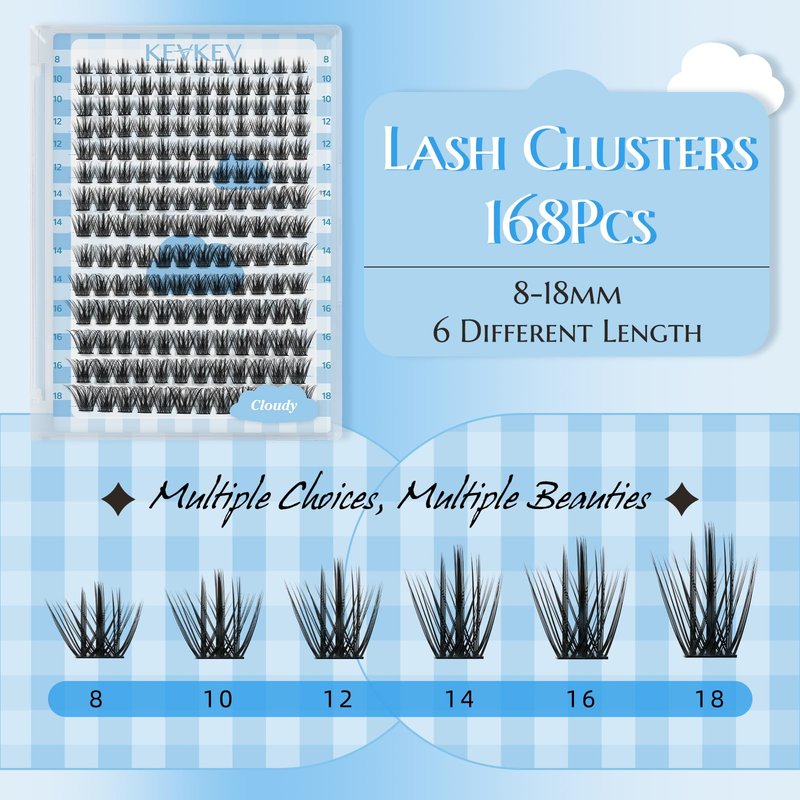 - Comfortable and Beauty Individual Lashes: KevKev DIY lash extensions kit include168PCS cluster lashes in 6 different lengths(8-18mm mix), the eyelash clusters providing a comfortable and lightweight wearing experience.