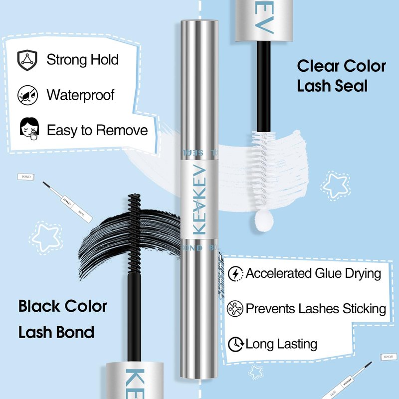 - 2 in 1 KevKev Lash Bond and Seal: Transform your lashes with KEVKEV lash bond and seal, a compact and portable 2-in-1 package where bond and seal are combined into a 5ml double-head. And with black and white color options on the bond side, you could choose which you like.