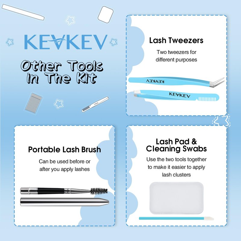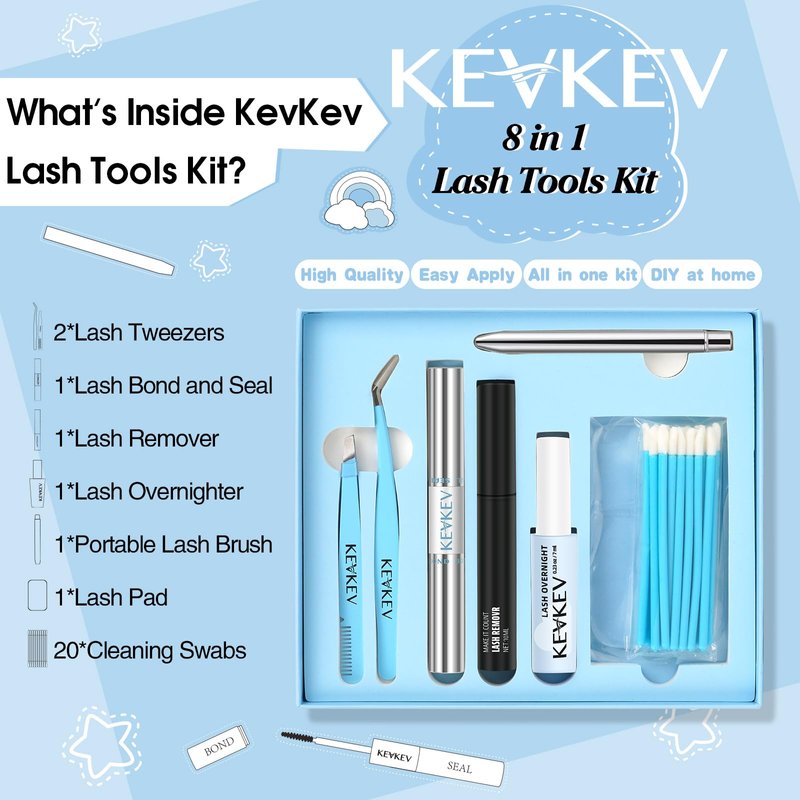 - 8 in 1 Lash Tools Kit: Have everything you need in apply and remove lash clusters! KevKev lash tools kit include: 2*Lash Tweezers, 1*Lash Bond and Seal, 1*Lash Remover, 1*Lash Overnighter, 1*Portable Lash Brush, 1*Lash Pad, 20*Cleaning Swabs